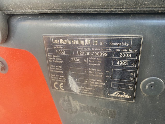CARRELLO ELEVATORE DIESEL LINDE 35 Q.LI – ANNO 2009 – ELEVAZIONE 4400 MM STANDARD – DISTRIBUTORE 4 VIE – RUOTE SUPERELASTICHE – TRASMSIIONE IDROSTATICA – TRASLATRE, ORE 9230